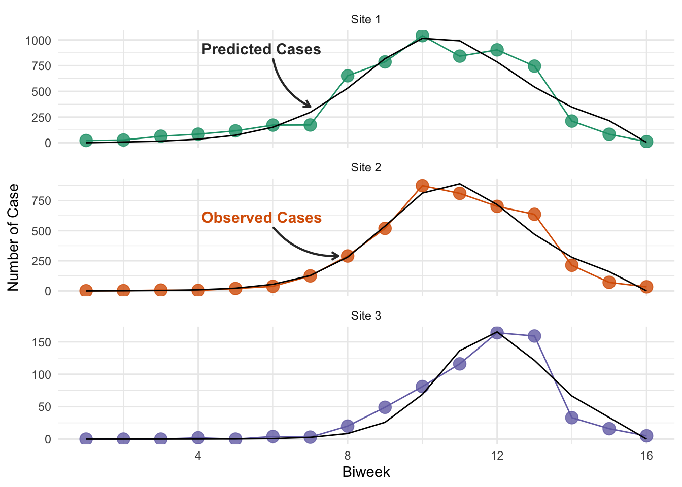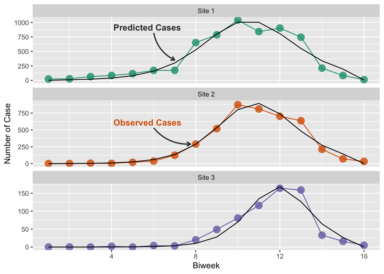 aes(x = biweek, y = cases, color = site, fill = site, group = site)