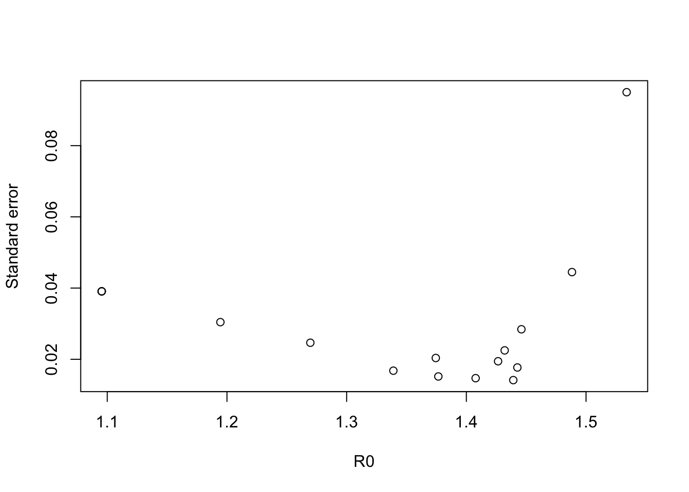A defect with this method is that it uses only a small fraction of the information that might be available, i.e., the first few data points. Indeed, there is nothing in the method that tells one how many data points to use–this is a matter of judgment. Further, there is a tradeoff in that as more and more data points are used the precision of the estimate increases, but this comes at a cost of additional bias. Plot the estimate of \(R_0\) obtained from \(n=3, 4, 5, ...\) data points against the standard error of the slope from the regression analysis to show this tradeoff.