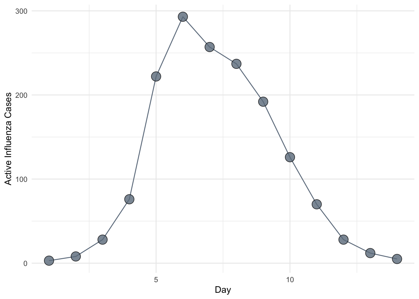 So far in this class we have focused on the theory of infectious disease. Often, however, we will want to apply this theory to particular situations. One of the key applied problems in epidemic modeling is the estimation of \(R_0\) from outbreak data. In this session, we study two methods for estimating \(R_0\) from an epidemic curve. As a running example, we will use the data on influenza in a British boarding school.