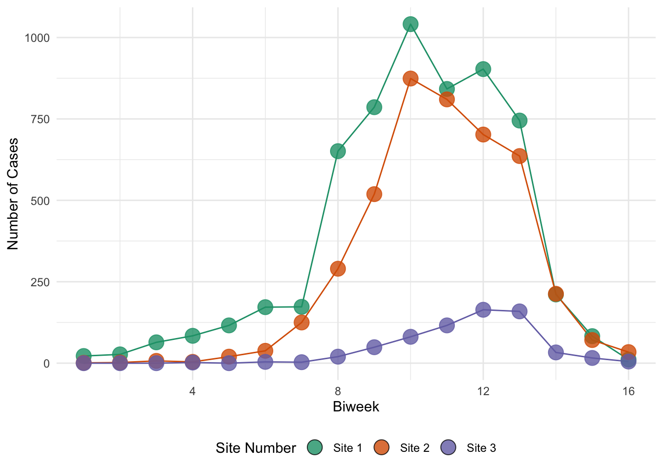 labs(x = "Biweek", y = "Number of Cases", fill = "Site Number") +